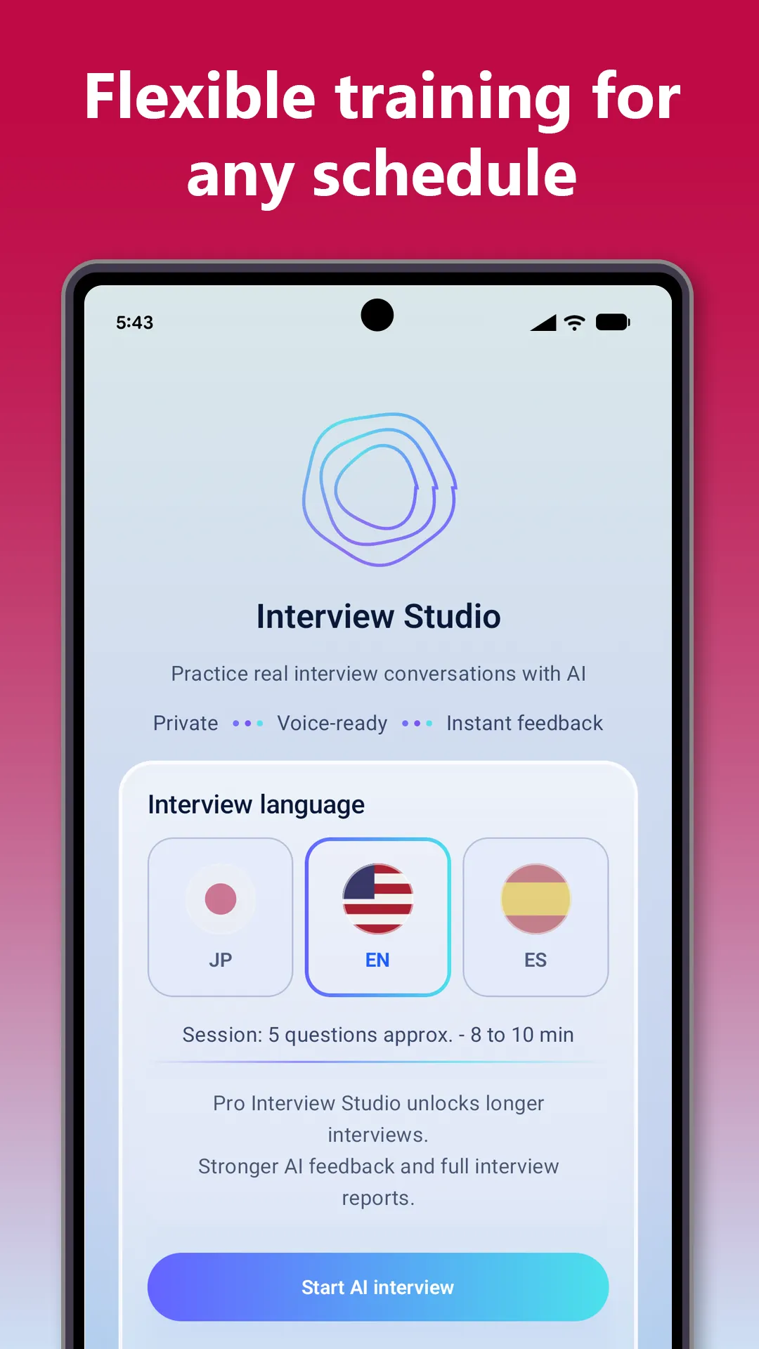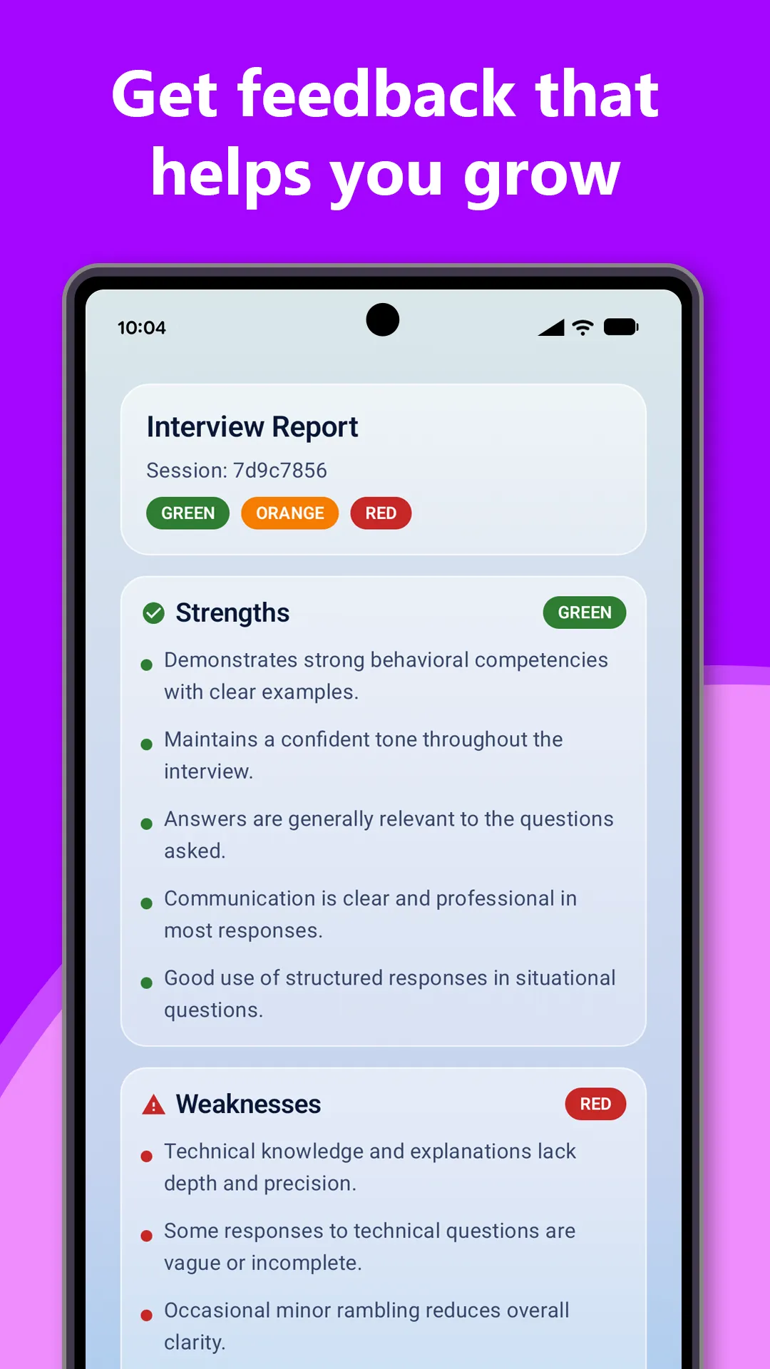 You answer questions in your own words, and the app analyzes your responses to highlight strengths, gaps, and opportunities to improve.
